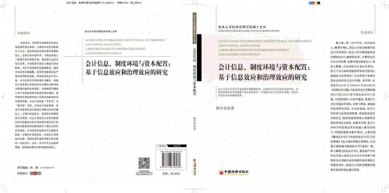 近日,我院会计学系教师韩少真博士撰写的专著《会计信息、制度环境与资本配置:基于信息效应与治理效应的研究》由中国经济出版社出版,该书共8章内容,约33.8万字。