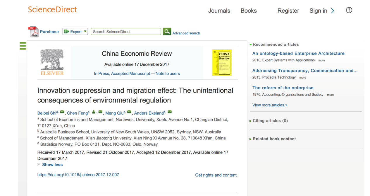 近日,我院2016级博士生史贝贝、我院2015届本科毕业生冯晨、仇萌,以及挪威国家统计局高级经济师Anders Ekeland先生的合著论文被研究中国问题的知名SSCI检索期刊《China Economic Review》接收并在线发表:https://doi.org/10.1016/j.chieco.2017.12.007。CER的五年综合影响因子为2.008
