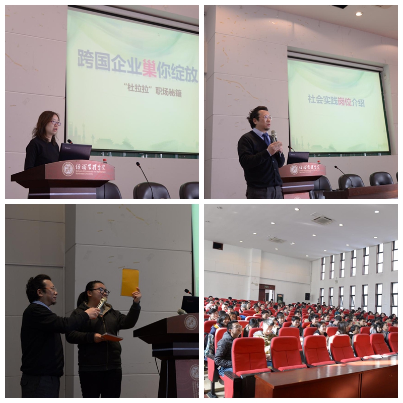 1月11日,15、16级财管和17级工商管理类同学们在金海恒业报告厅聆听了来自雀巢西北区分公司两位管理者的题为《跨国公司巢你绽放:“杜拉拉”职场秘籍》的精彩演讲。