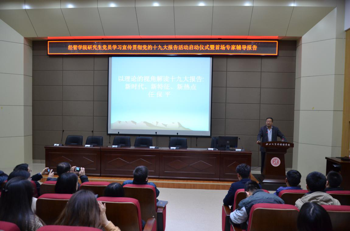 在活动中,陕西省“学习贯彻党的十九大精神”宣讲团专家、我校“学习贯彻党的十九大精神”专家报告团成员、经管学院院长任保平教授作了题为《以理论的视角解读十九大报告:新时代、新特征、新热点》的专题报告。
