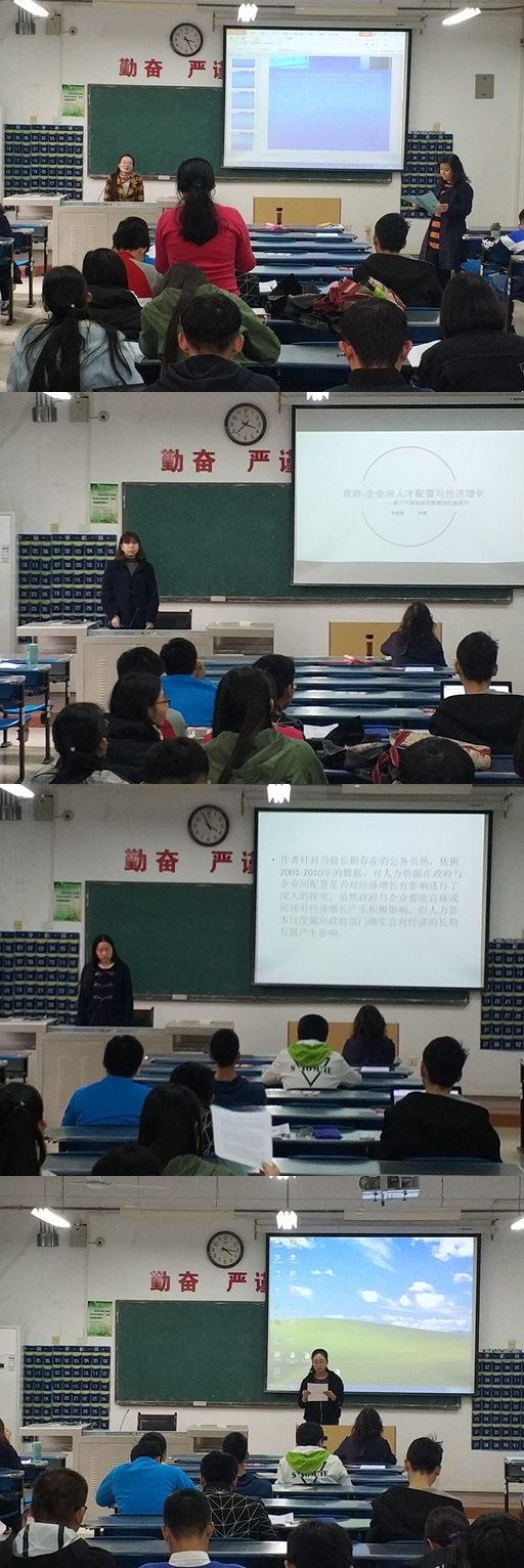 “基地学术课堂”的第二单元为文献研习,2015级经济学基地班本科生赵静讲解了《政府—企业间人才配置与经济增长——基于中国地级市数据的经验研究》,2016级经济学基地班本科生李艳琪担任评论。