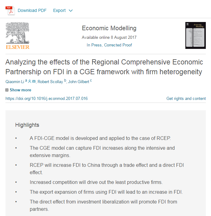 我院世界经济与贸易系教师李侨敏博士的论文《Analyzing the effects of the Regional Comprehensive Economic Partnership on FDI in a CGE framework with firm heterogeneity》在SSCI检索期刊《Economic Modelling》上在线发表,论文链接:http://www.sciencedirect.com/science/article/pii/S0264999317301773 。