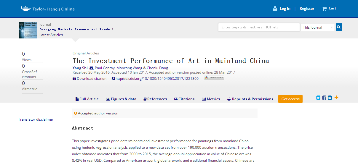 近日,我院青年教师石阳博士和王满仓教授等的研究论文《The Investment Performance of Art in Mainland China》在SSCI检索期刊《Emerging Markets Finance and Trade》上在线发表。该期刊的影响因子在344种经济学SSCI期刊中排名第186位。(论文链接:http://www.tandfonline.com/doi/abs/10.1080/1540496X.2017.1281800?journalCode=mree20)