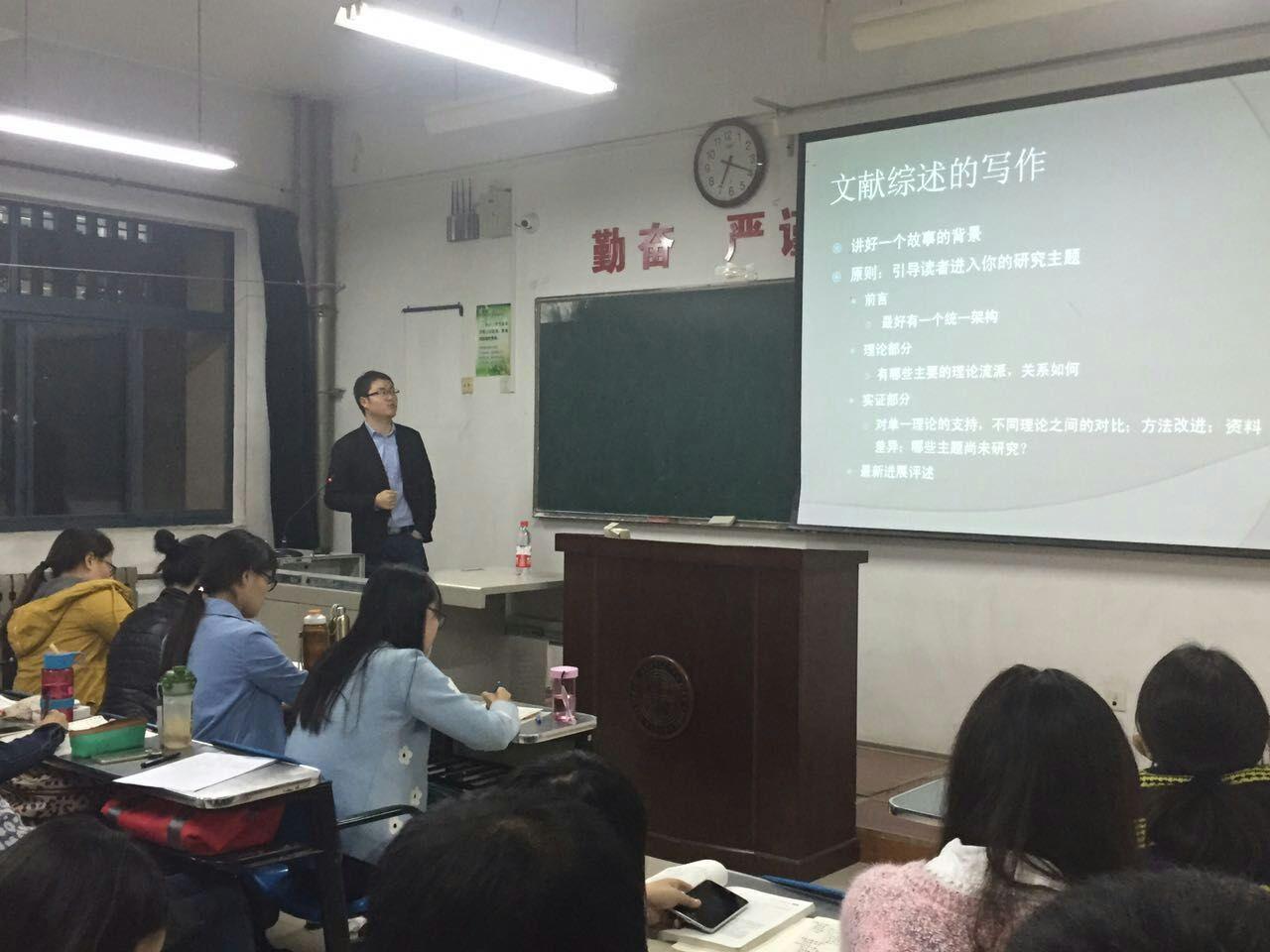 10月14日研究生学术月讲座第一讲在长安校区1210教室举行。郭晗博士应邀做题为《文献收集、论文写作与投稿》的报告,郭晗博士从文献收集与整理、常用数据库、论文写作范式、论文修改与投稿注意事项等方面与同学们进行分享交流。他指出,读精品文献才能获得新思想、新方法,同时,研读文献也要有统一的主题,建立不同内容之间的桥梁,并及时记录文章观点和自己的想法。
