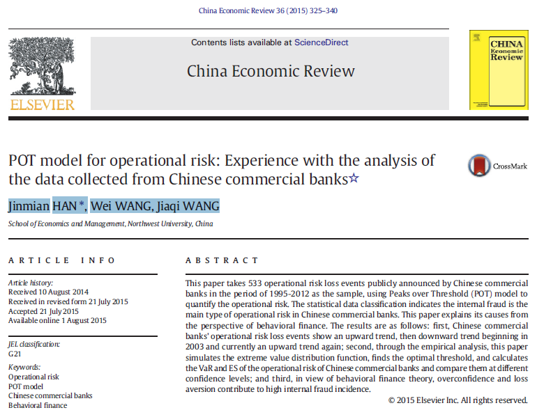 近日,我院韩锦绵副教授和其研究生的论文《POT model for operational risk: Experience with the analysis of the data collected from Chinese commercial banks》在SSCI期刊China Economic Review发表。(China Economic Review36 (2015), 325-340)