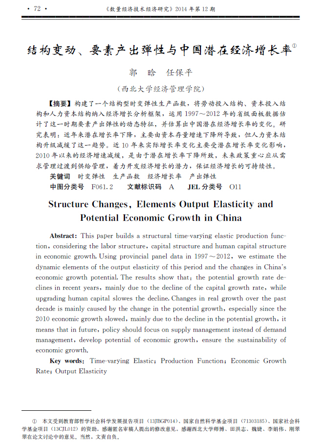 近日,我院2012级西方经济学博士研究生郭晗与导师任保平教授合作撰写的论文《结构变动、要素产出弹性与中国潜在经济增长率》在权威期刊《数量经济技术经济研究》2014年第12期发表,全文1.6万余字。该论文是教育部哲学社会科学发展报告项目“中国经济增长质量发展报告”和国家社科基金成果文库项目“经济增长质量的逻辑”的成果,是西北大学经济增长质量研究团队在“中国经济增长潜力研究”方向的最新成果。
