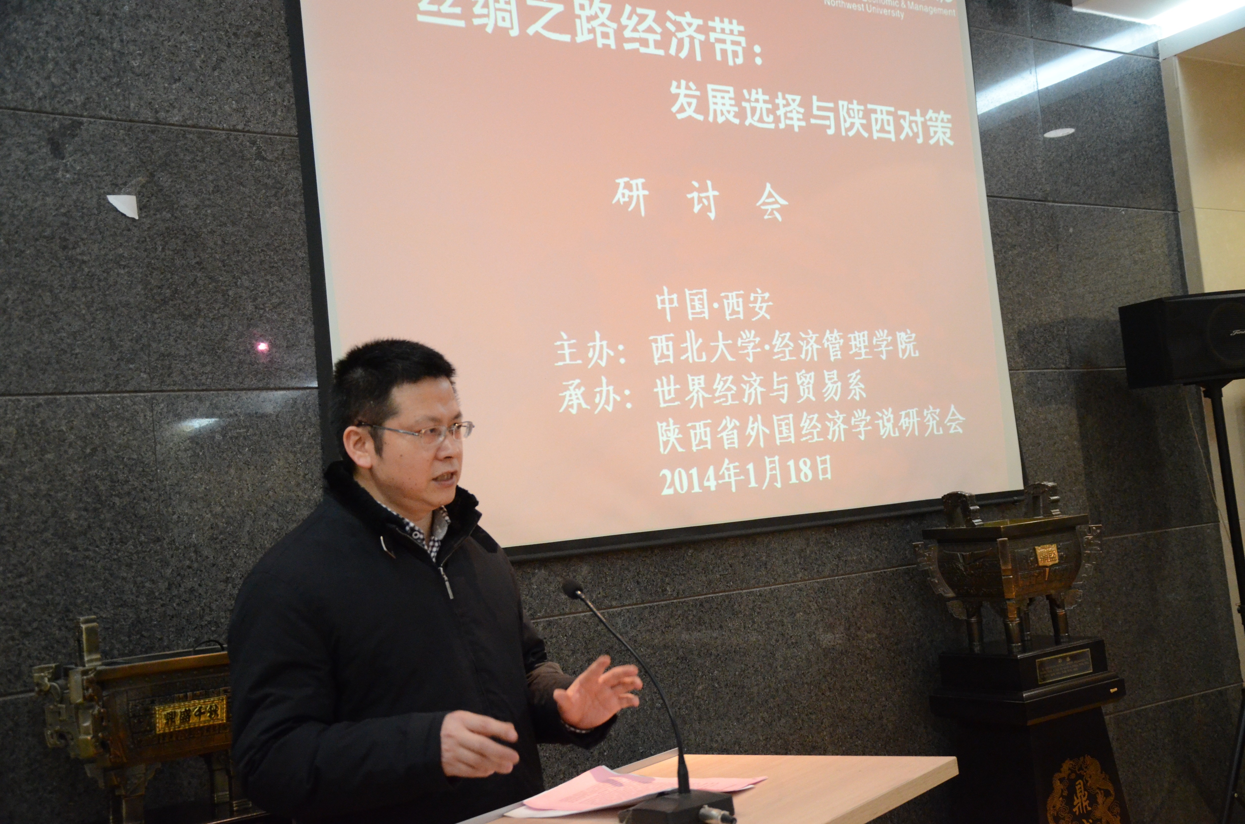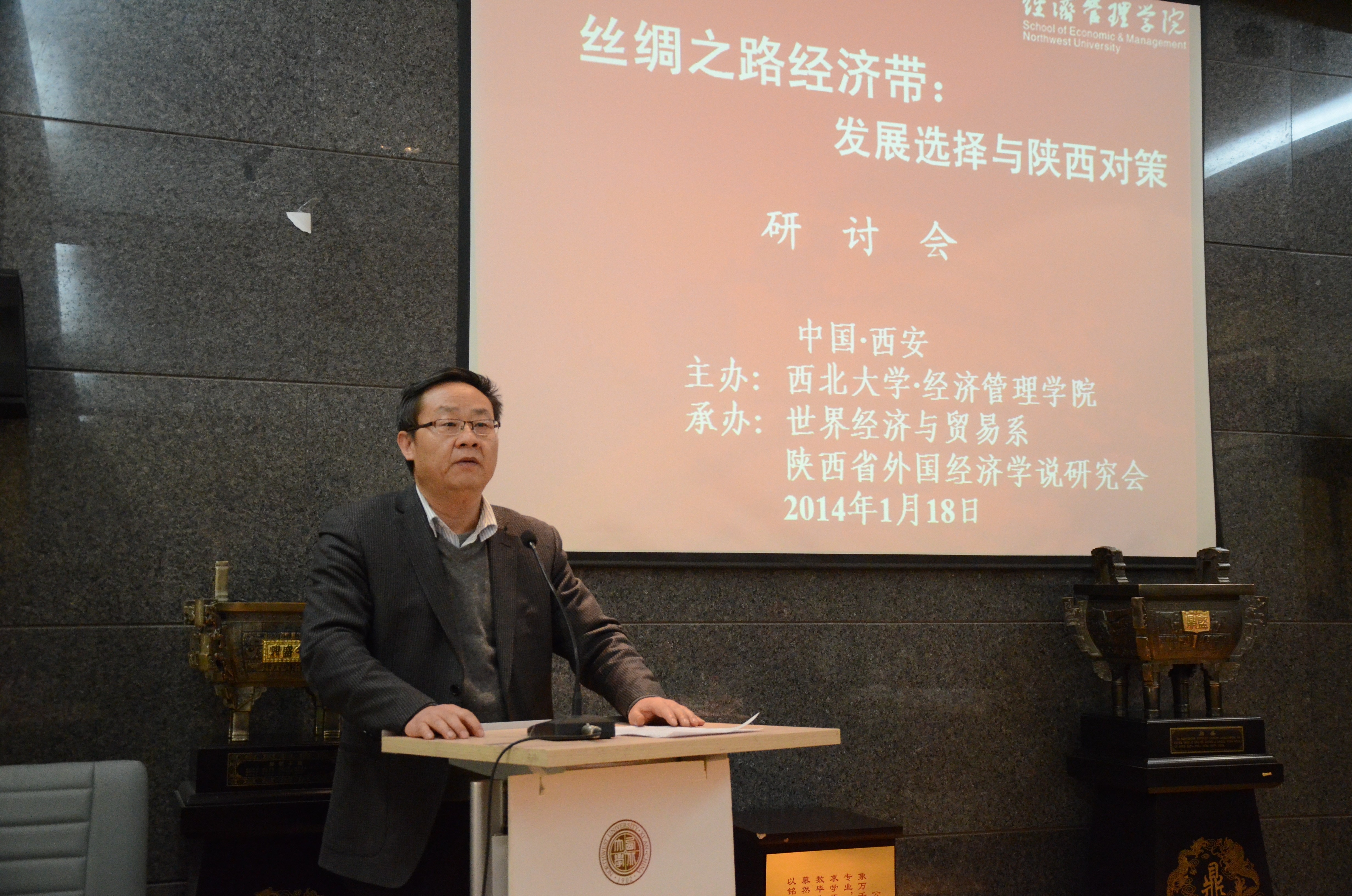 2014年1月18日下午,由我院主办、世界经济与贸易系和陕西省外国经济学说研究会联合承办的“丝绸之路经济带:发展选择与陕西对策”研讨会在太白校区隆重举行。西北大学校长方光华、陕西省社科联副主席何泽彪、陕西省政府研究室副主任杨三省、西安交通大学欧亚经济论坛研究院院长冯宗宪、陕西省教育厅科技处处长甘世平,陕西省委宣传部理论处副处长安海胜等出席研讨会,来自西北大学社科处、国际交流学院、776net必赢官网、中东研究所、文化遗产学院的领导和专家,以及我院世界经济与贸易系和旅游系部分教师及学生代表共40余人参加会议。研讨会由吴振磊副院长和国贸系吴航主任共同主持。