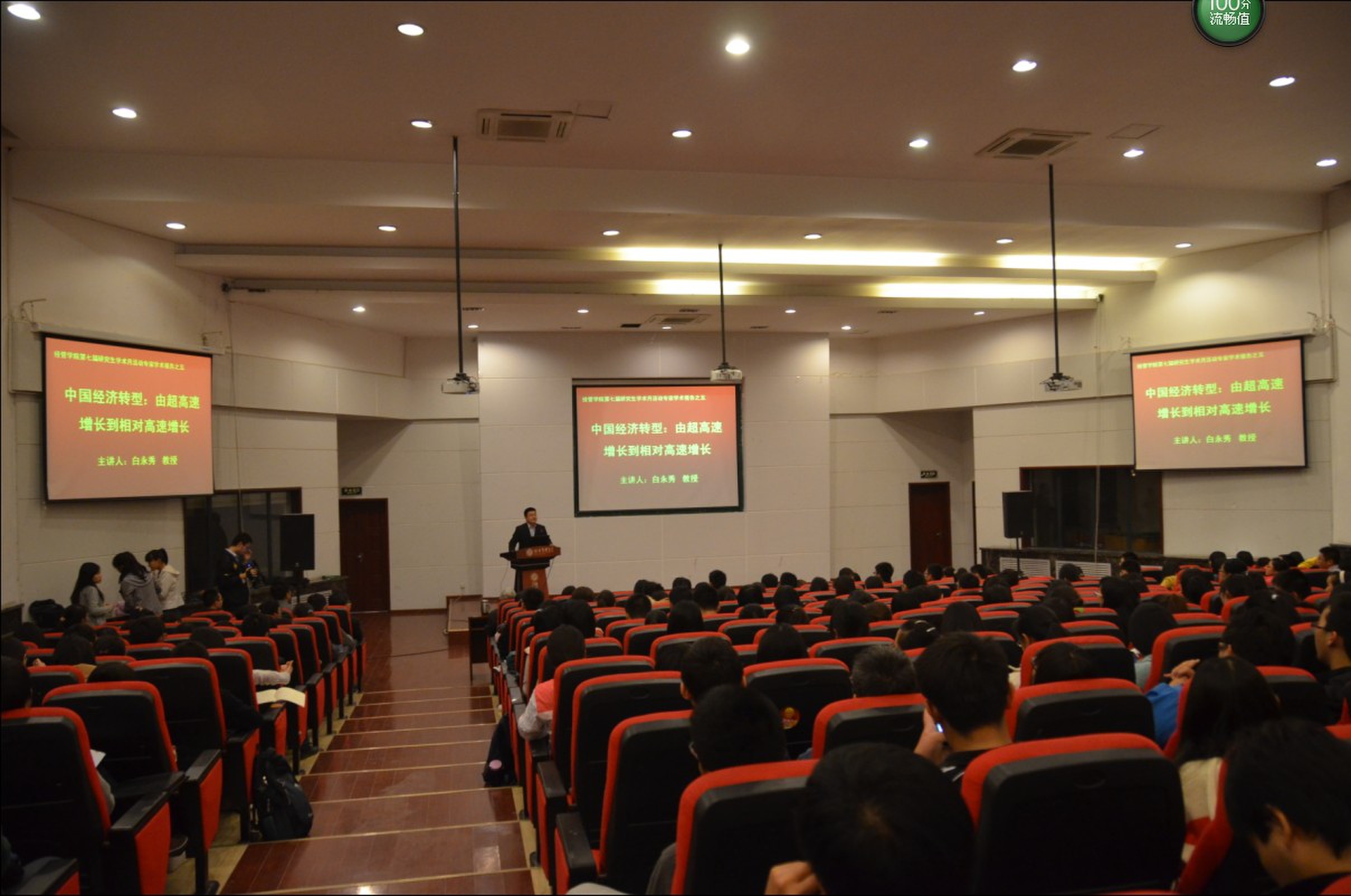 10月24日晚7点,我院第七届研究生学术月活动专家报告会之五在金海恒业报告厅举行,西北大学学术委员会副主任、776net必赢官网学术委员会主席白永秀教授应邀作了题为《中国经济转型:由超高速增长到相对高速增长》的学术报告。报告会由副院长吴振磊副教授主持,我院部分教师、研究生和本科生300余人到现场聆听了报告。