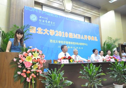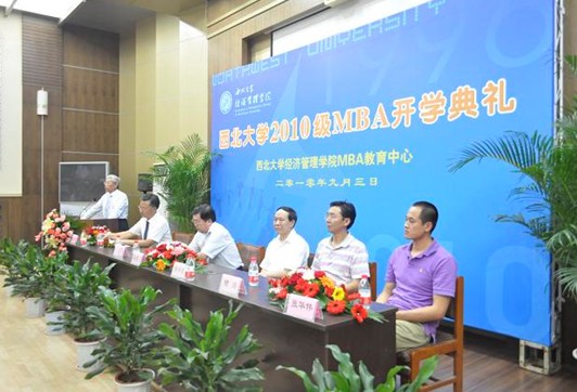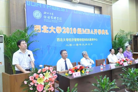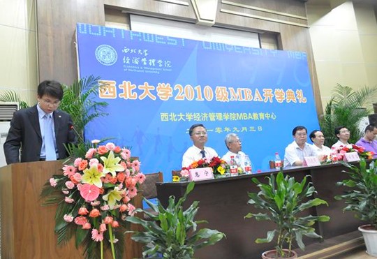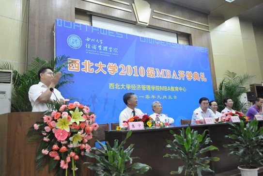 金秋九月,我们迎来了西北大学MBA542名新学员(国家班336,经贸委班41,陕西班165)。2010年9月3日晚7时30分,西北大学2010级MBA新生开学典礼在图书馆报告厅隆重举行。出席典礼的有:西北大学副校长、博士生导师任宗哲教授,776net必赢官网院长、博士生导师白永秀教授,院党委书记薛来前研究员,院党委副书记樊涛副研究员、校研究生处专业学位科科长张华伟老师、776net必赢官网院长助理、各系系主任、各中心主任以及各教学点负责人和MBA中心所有工作人员。2010级国家MBA和陕西MBA学员代表共300余人参加了开学典礼。开学典礼由776net必赢官网院长助理、博士生导师、MBA中心主任惠宁教授主持。