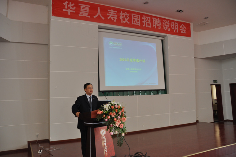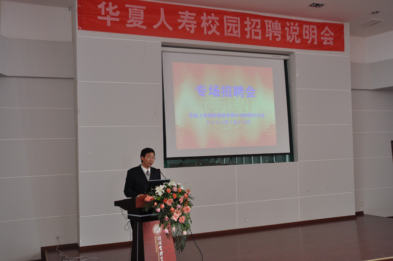 2009年3月26日上午,华夏人寿保险股份有限公司陕西分公司应邀到我院召开专场招聘会。院党总支书记薛来前老师,华夏人寿保险股份有限公司陕西分公司副总经理陶娟女士、副总经理张毅刚先生及人事部负责人出席了招聘会仪式。招聘会仪式由院党总支副书记樊涛老师主持。