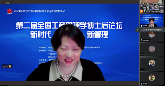 史丹代表中国社会科学院工业经济研究所对本次论坛的顺利召开表示热烈祝贺,向支持本次论坛的西北大学和西北大学经管学院表示感谢,并向参加此次论坛的领导、专家学者和博士后表示欢迎。她介绍了工业经济研究所的基本情况和工经济博士后培养的基本情况,希望此次论坛认真贯彻党的十九届六中全会决议精神,深入开展学术交流研讨,全方位、多视角、深层次交流新时代背景下的中国工商管理问题。她表示,将会全力支持博士后论坛持续办下去,办出更显著的成效。