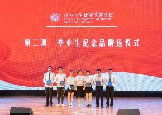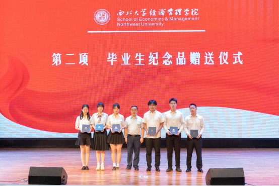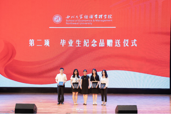 学院领导和各系教师代表向2022届本硕博毕业生代表赠送了精心准备的纪念品黑檀木书签一对、签字笔一支和全院师生大合影一张,书签上雕刻着学院原院长任保平教授亲手所书“潮涌海阔,千帆竞秀”的赠言,表达了学院对毕业生的殷切期望和祝福期许。