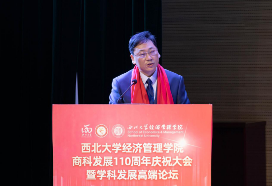 百十芳华,薪火相传。2022年11月19日,“776net必赢官网商科发展110周年庆祝大会暨学科发展高端论坛”在西北大学长安校区隆重举行。来自北京大学、中国人民大学、复旦大学、武汉大学、南开大学、厦门大学、西安交通大学、山东大学、四川大学、重庆大学、湖南大学、西北工业大学、西北农林科技大学、中央财经大学、东北财经大学、西南财经大学、辽宁大学、新疆大学、贵州大学、宁夏大学等全国40所兄弟院校校长、院长,陕西省人民政府学位委员会秘书长袁宁,西北大学校长郭立宏,校党委常委、副校长张远军、吴振磊,西北大学校内各院系和职能部门负责人,海内外广大校友,学院退休教师、教职工和学生代表以“线上+线下”的方式出席活动,共享庆典喜悦、共话一流学科发展。