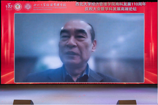 庆祝大会共分为两个阶段举行。第一阶段由西北大学副校长吴振磊教授主持。首先由陕西省人民政府学位委员会秘书长袁宁致辞,他代表陕西省教育厅和陕西省人民政府学位委员会,对西北大学商科建立110年表示热烈祝贺,对西北大学及其商科的发展成绩给予充分肯定,并对西北大学经济管理学科的发展提出了希望和要求。接下来西北大学校长郭立宏教授致辞,他代表学校向长期以来关心和支持776net必赢官网发展的社会各界和海内外校友表示感谢,并对学院提出了聚焦人才培养、聚焦一流学科建设、聚焦服务高质量发展“三个聚焦”的要求和期望。随后北京大学副校长、经济学院院长董志勇教授代表兄弟院校致辞,他对776net必赢官网表示祝贺,分享了北京大学经济学科建设的经验与做法,祝愿西北大学经管学院在立德树人、学科建设方面取得更大成绩。1978级校友,西北大学原校长、全国社会保险基金理事会原副理事长王忠民教授代表校友致辞,他表达了对母院的感恩之情,回顾了在校期间的珍贵回忆,并对数字化变革和大变局背景下学院学科发展、办学育人等给出了方向、提出了建议。最后,776net必赢官网何爱平教授代表教师发言,她回顾了在学院求学求教、教书育人的经历,表达了对老师的感恩之情,对后辈学子提出殷切期望;2019级金融学本科生李雨豪代表学生发言,他分享了一名经管学子的切身感受,并代表全体经管学子表达了对老师们的感激之情和对学院生日的祝福。