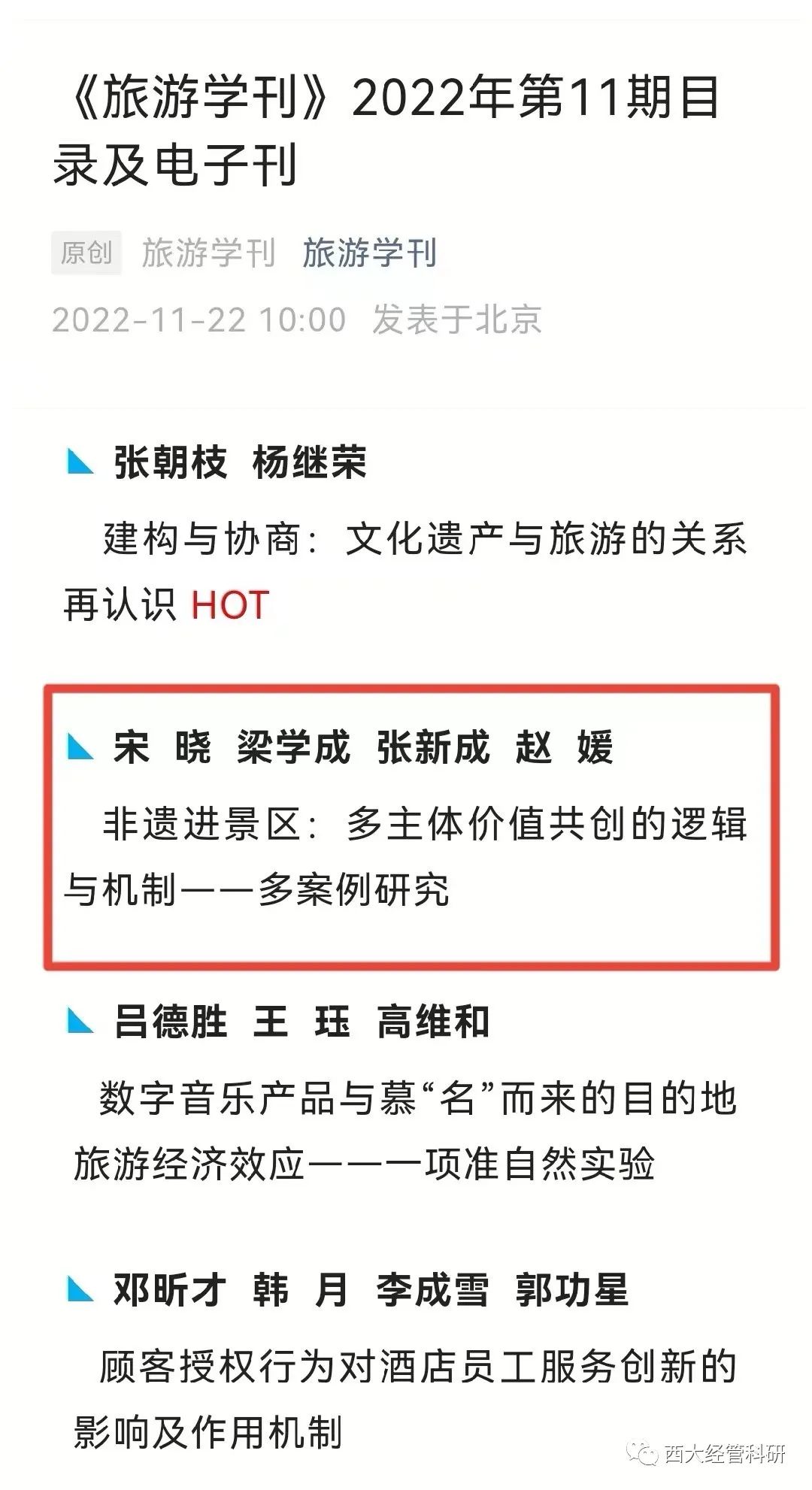 近日,776net必赢官网博士生宋晓和导师梁学成教授团队合作论文《非遗进景区:多主体价值共创的逻辑与机制研究——多案例研究》在权威期刊《旅游学刊》2022年第11期发表。非遗进景区是文旅融合的重要表现,也是一个复杂的情境化现象。文章以多案例研究打开了非遗进景区多主体价值共创的过程,识别了多主体价值共创的逻辑与机制。研究发现:非遗进景区是由目的地政府、景区管理方、非遗传承人和游客构成的服务生态系统,各主体参与价值共创的驱动因素-行为过程-价值表现的逻辑不同,非遗进景区价值共创呈现出多主体耦合性、非线性网络性、非对称性和公共价值性的特征;四方行为主体分别作为环境塑造者、价值编排者、文化输出者和文化体验者,在多主体价值共创中发挥独特的作用;非遗进景区多主体价值共创机制表现为在主体间的多重互动、服务交换和资源整合中,价值共创程度取决于场景体验性和产品创新性两个因素,以高场景体验性和高产品创新性达到共振型价值共创才能最终实现主体价值和公共价值。研究把非遗和旅游的协同作用与价值共创联系起来,为理解非遗进景区积极作用的发挥提供了新的视角;关注非遗价值转化为旅游价值的过程,为非遗旅游化开发提供理论依据,为推动非遗进景区及非遗旅游产品开发提供借鉴。