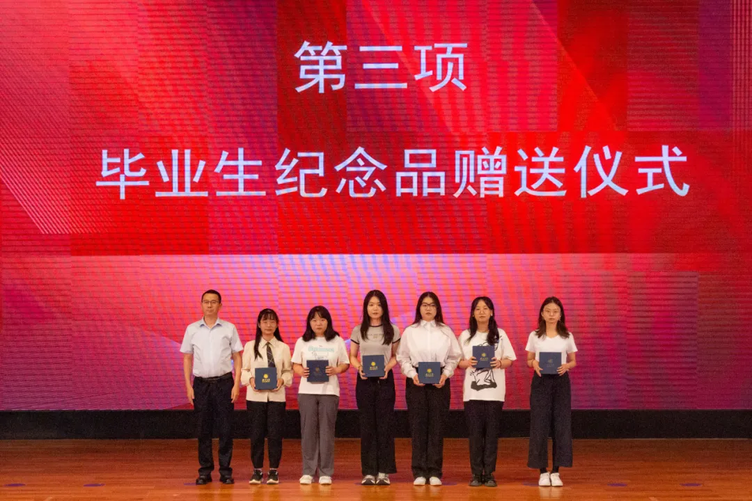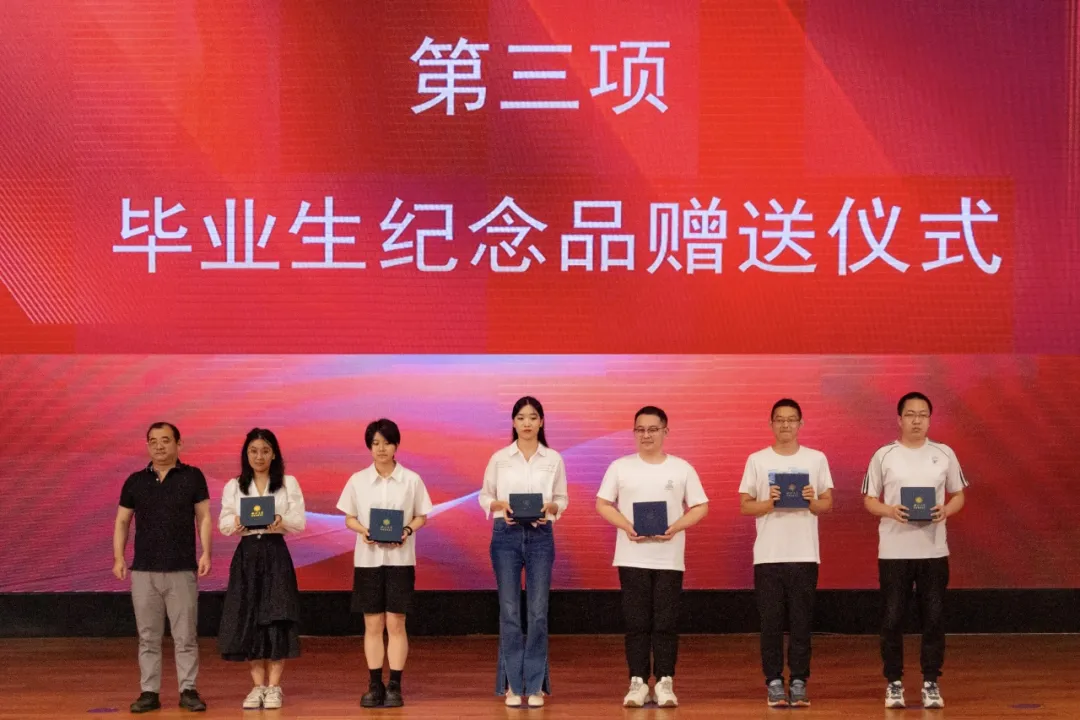 典礼第三项:学院领导和各系教师代表向2024届本硕博毕业生代表赠送了学院精心准备的纪念品黑檀木书签、签字笔和全院师生大合影,书签上雕刻着“潮涌海阔,千帆竞秀”的赠言和宏观经济大楼图案,表达了学院对毕业生的殷切期望和祝福期许。