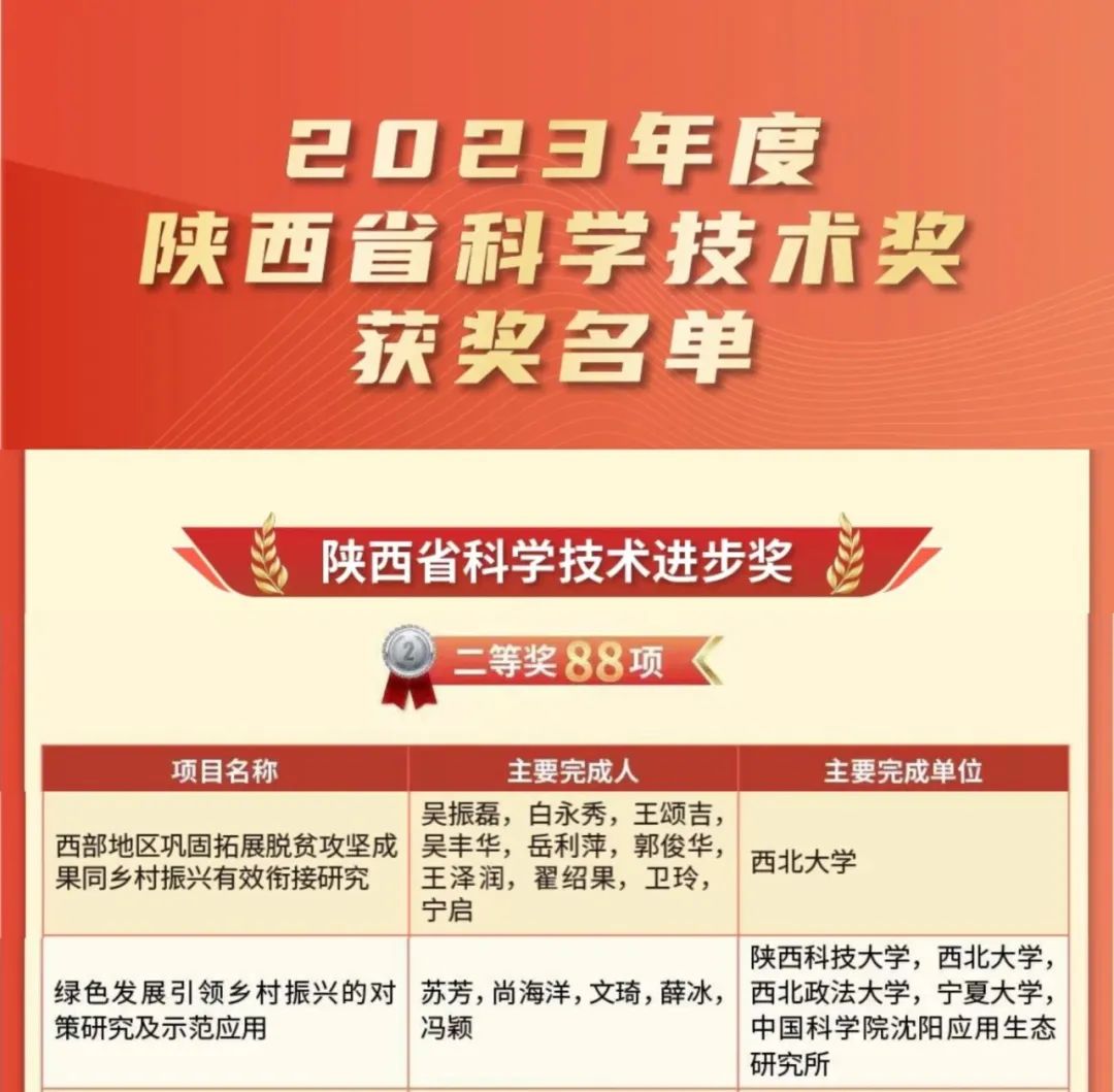 近期,2023年度陕西省科学技术进步奖获奖名单正式发布。我院吴振磊教授主持申报的“西部地区巩固拓展脱贫攻坚成果同乡村振兴有效衔接研究”,苏芳教授主持申报的“绿色发展引领乡村振兴的对策研究及示范应用”两项成果分别荣获科技进步奖二等奖,获奖数量在全省哲社领域名列前茅,充分体现了学院团队建设和学科发展的重要成效。