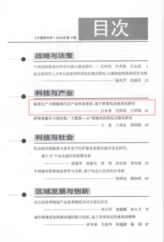 近日,我院白永秀教授、博士生闫雪培和青年教师王泽润博士的合作论文《新质生产力赋能现代化产业体系建设——基于要素构成视角的研究》在权威期刊《中国软科学》2024年第12期以封面文章形式刊发。