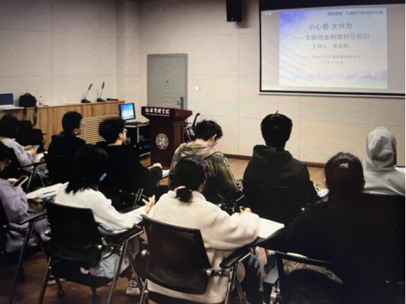 为进一步加强心理健康教育四级网络工作队伍建设,提升心理委员常见心理问题识别和朋辈心理辅导的工作技能,切实发挥协助辅导员、班主任开展心理健康教育工作的作用,我校于9月拉开了西北大学2022年“阳光使者”心理骨干培训的帷幕。从10月28日至11月3日共有四场专题讲座,依次为“心理委员的角色与定位”“心理危机的识别与应对”“朋辈心理互助技术”“小心委,大作为——主题班会的策划与组织”,我院均集体组织心理骨干认真学习。