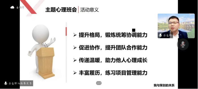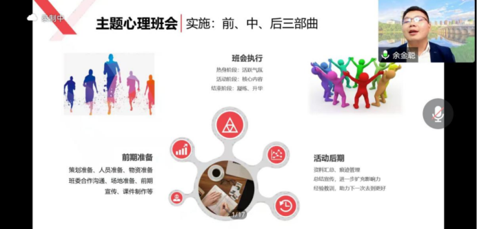 11月1日晚“小心委,大作为——主题班会的策划与组织”,中南财经政法大学心理健康教育咨询中心、青少年心理发展研究所副教授余金聪老师从“初识主题心理班会”、“主题心理班会策划结构”、“主题心理班会选题”、“主题心理班会活动形式”、“主题心理班会注意事项”、“主题心理班会实操案例”六个方面展开了分享。