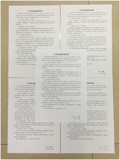 本次诚信教育主题月期间,我院团委积极组织我院所有家庭经济困难学生在《大学生诚信承诺书》上签字,承诺他们在学习上做到态度端正,严谨求实;在经济上做到以信立人,履约践诺;生活上做到遵纪守法,弘扬正气;贷款与受助方面做到自强不息,严于律己;在诚信上网方面做到知行统一,自省自律。