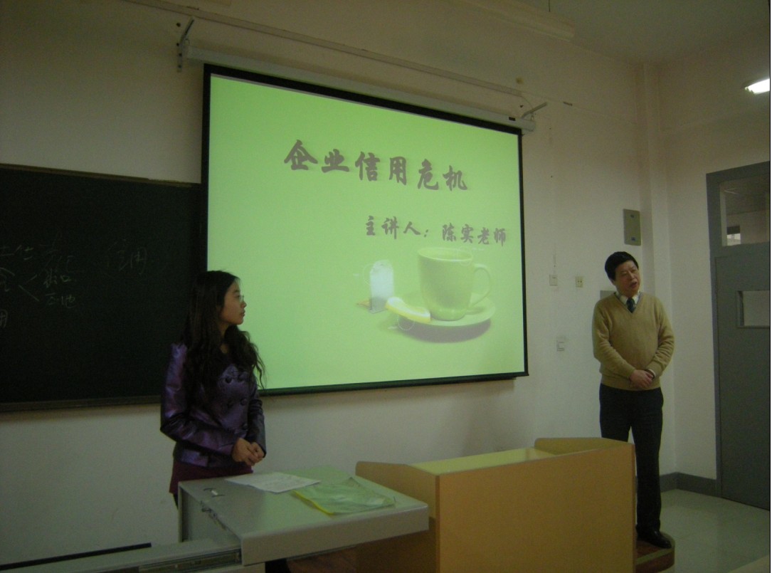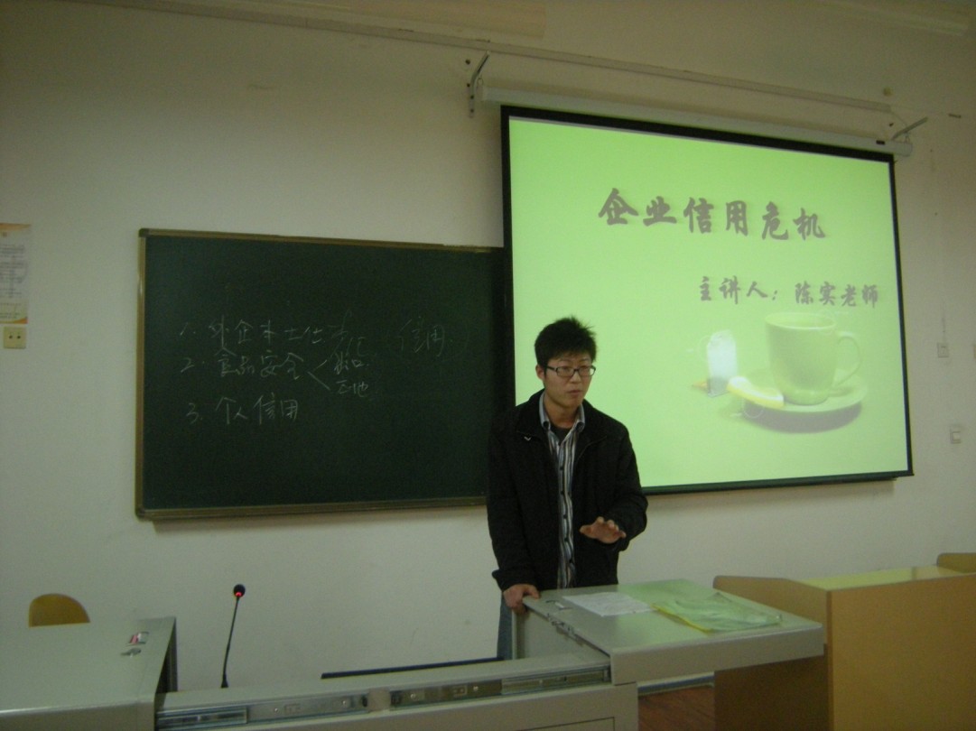 本次活动以“企业信用危机”为主题,并有幸邀请到了我院陈实副教授与同学们就此话题进行深入探讨。陈实老师首先讲述了企业信用危机的危害,并分析了信用危机产生的原因,同时通过对比中外文化制度等方面的差异,引出导致信用危机的根源,即制度和信仰。陈老师幽默风趣的语言,使整个会场的气氛轻松而又活泼,同学们纷纷发表自己的看法和见解。同学们讨论了信用危机与经济发展状况的关系,认为在现阶段我国的市场经济还不完善,出现企业信用危机、责任缺失的情况不可避免;紧接着,同学们从外企本土化、食品安全、个人信用三方面对企业信用危机发生的根源进行了深入探讨;最后,同学们围绕如何解决企业信用危机展开了热烈讨论。