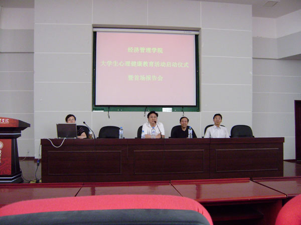 大会由学院团分委书记李宝星老师主持。学生工作处张少为副处长讲了话,张老师对本次活动给予了充分肯定。张老师指出,当代大学生面临的社会竞争压力比较大,会产生相应的心理压力和困惑,当遇到挫折、失败、适应不良时,容易导致心理问题和心理环境的不卫生,同学们要学会调节郁闷情绪,学会化解生活烦恼。学院适时举办心理健康教育是非常有必要的,是对学生成长教育的一个重要环节,并希望同学们能够在学院举办专题讲座、知识宣传、健康普查等一系列教育活动中取得较大收获,学会心理调适的方法,学会如何排解忧虑,化解郁闷,维护健康的心理环境。并祝愿同学们拥有健康身体的同时,更要拥有健康的心理状态,预祝经管学院心理健康教育活动圆满成功。