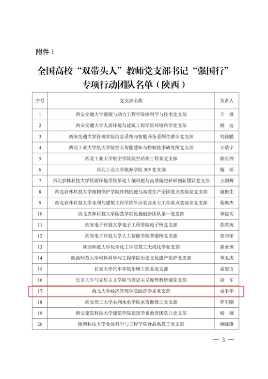近日,教育部办公厅公布了全国高校“双带头人”教师党支部书记“强国行”专项行动团队名单,我院经济学系党支部成功入选。